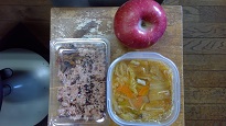 最後に、豚汁、赤飯での会食とリンゴの配布が行われました。