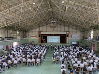 例年1.2年生合同で、キャリア教育の一環で地元企業の方にお越しいただき、仕事の内容や仕事に対する心構えなど現場の人の話を聞いています。 今回は、20社の方々に来校いただき、職業選択の参考となる話しをしてもらいました。